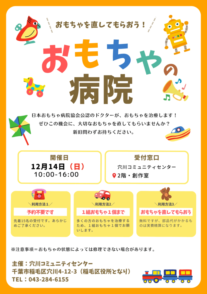 おもちゃの病院が開院します。あなたが大切にしているおもちゃを直してもらいませんか。