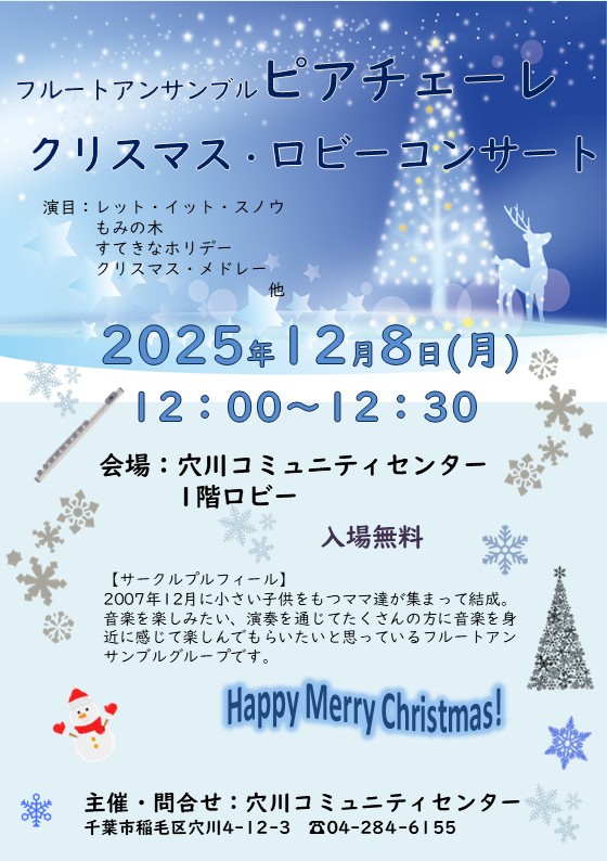 12/8 ピアチェーレ・ロビーコンサート 2025年11月30日 最終更新日時 : 2025年11月30日 穴川コミュニティセンター 未開催 フルートの透きとおる音で、クリスマスソングを楽しんでみませんか