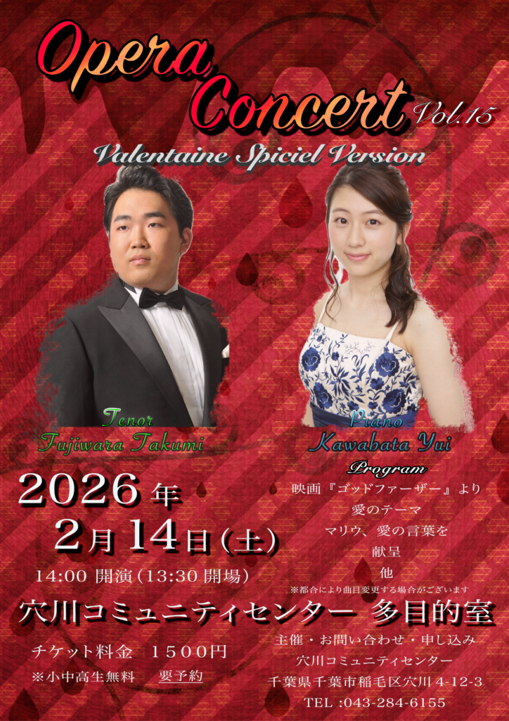 2/14 「オペラコンサート」開催 2026年2月8日 最終更新日時 : 2026年2月8日 穴川コミュニティセンター 未開催 映画「ゴットファザー」より愛のテーマ/マリウ/愛の言葉を/献呈など、バレンタインの特別バージョンでお送りいたします。